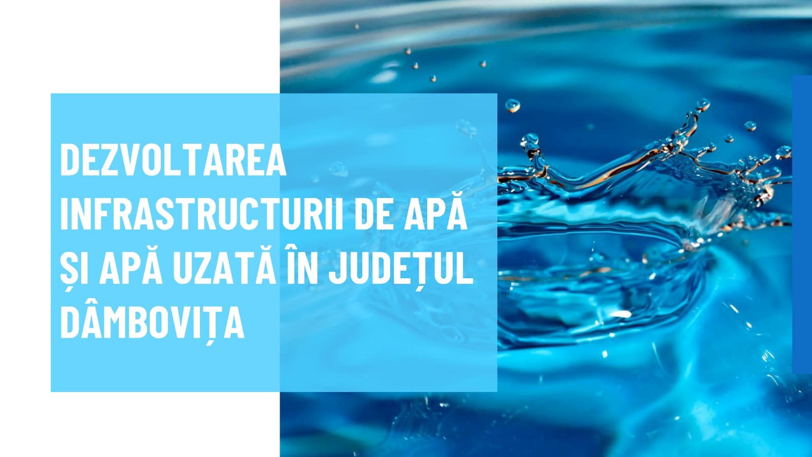 Se vor realiza investiții de reabilitare, extindere și înființare rețele de alimentare cu apă și canalizare în următoarele UAT-uri : Târgoviște, Moreni, Fieni, Pucioasa, Răcari, Aninoasa, Băleni, Brănești, Braniștea, Buciumeni, Bucșani, Butimanu, Ciocănești, Cobia, Conțești, Corbii Mari, Dragodana, Dragomirești, Finta, Glodeni, Gura Foii, Gura Ocniței, Hulubești, Iedera, Lucieni, Ludești, Lungulețu, Malu cu Flori, Mănești, Mătăsaru, Mogoșani, Moroeni, Morteni, Niculești, Nucet, Ocnița, Odobești, Perșinari, Petrești, Pietroșița, Potlogi, Produlești, Răzvad, Șotânga, Tătărani, Ulmi, Văcărești, Valea Lungă, Vișina, Vulcana Băi, Vulcana Pandele și Consiliul Județean Dâmbovița (52 UAT-uri), la care se adaugă UAT-urile Găești, Titu, Slobozia Moară, Crângurile, Sălcioara, Valea Mare, Răscăeți, Doicești, Dobra în care se fac investiții complementare