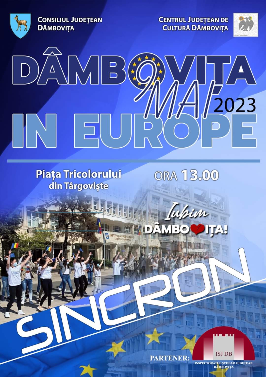 9 mai, Ziua Europei, în Piața Tricolorului are loc un SINCRON ce va fi susținut de elevi ai școlilor din Târgoviște, evenimentul este organizat de Centrul Județean de Cultură Dâmbovița în cadrul evenimentelor cultural-artistice dedicate Zilei Europei.