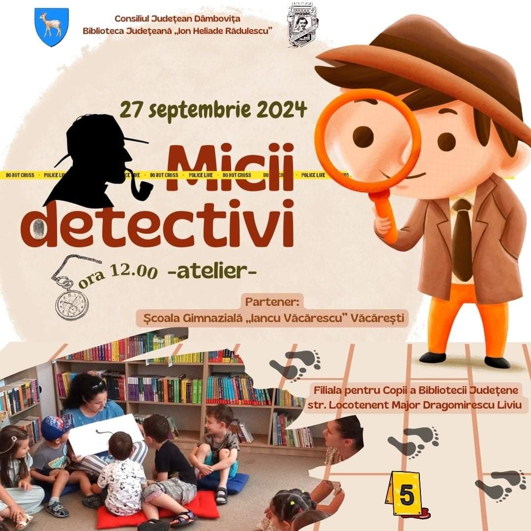Atelierul „Micii detectivi” reprezintă o oportunitate minunată pentru copiii din Văcărești și din împrejurimi de a-și petrece după-amiaza într-un mod distractiv și educativ, descoperind secretele lumii detectivilor și formând noi prietenii. Așadar, vineri, toți cei mici sunt invitați să devină parte din această aventură captivantă la Filiala pentru Copii a Bibliotecii Județene Dâmbovița!