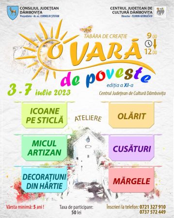Centrul Județean de Cultură Dâmbovița organizează cea de-a XI-a ediție a Taberei de Creație „O vară de poveste”, în perioada 3-7 iulie, așa cum v-a obișnuit de mulți ani.