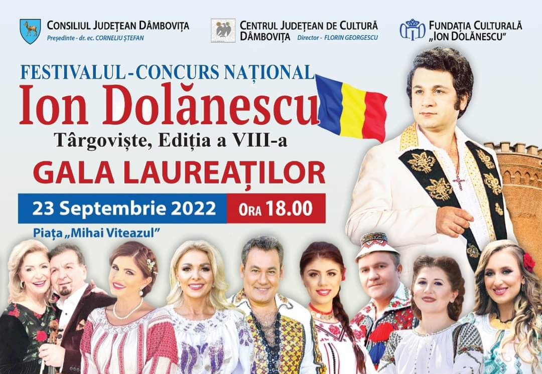 CJ Dâmbovița vă invită  la  Festivalul  „Ion Dolănescu”, ediția a VIII-a, alături de Fundaţia Culturală Ion Dolănescu, în perioada 22-23 septembrie 2022, în Piața Mihai Viteazul din Târgoviște, la un eveniment cultural de marcă, un regal al cântecului popular românesc: Festivalul – Concurs Naţional „Ion Dolănescu”, ediția a VIII-a.