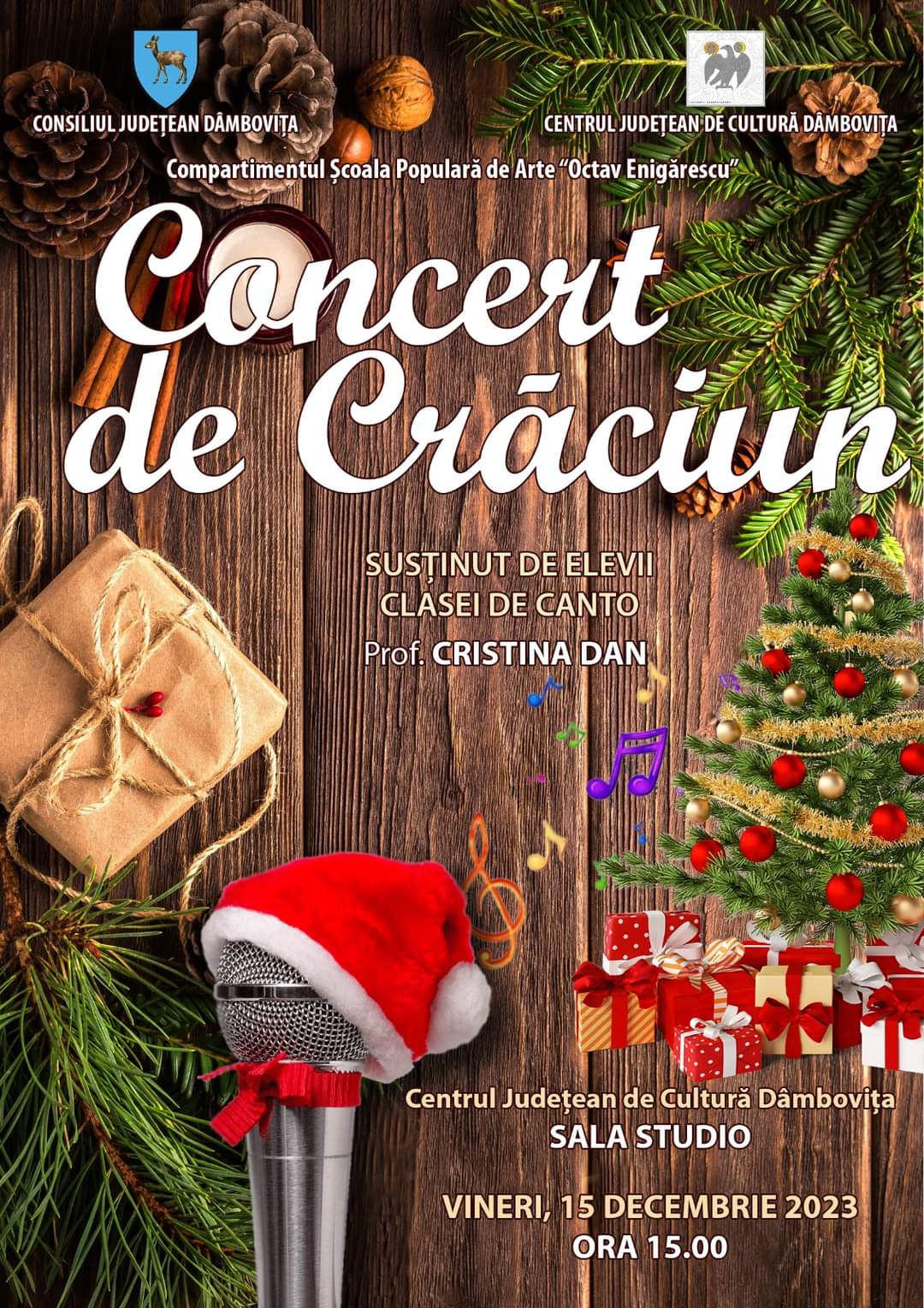 Concert de Crăciun în Sala Studio a Centrului Județean de Cultură Dâmbovița, susținut de Clasa de canto, din cadrul Școlii Populare de Arte „Octav Enigărescu”, sub îndrumarea doamnei profesor Cristina Dan.