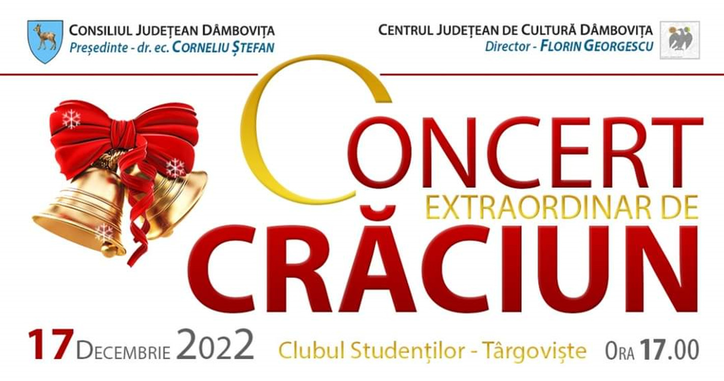 Concert extraordinar susținut de Orchestra Simfonică „Muntenia”, accesul doar pe bază de invitație, așadar, pe data de 17 decembrie, începând cu ora 17:00, CJ Dâmbovița vă așteptă la Clubul Studenților pentru a vă bucura de magia Sărbătorilor de iarnă, alături de invitații speciali: tenorii Vlad Miriță, Alin Stoica, Giorgio Martin și sopranele Amelia Antoniu și Adelina Cociobanu.