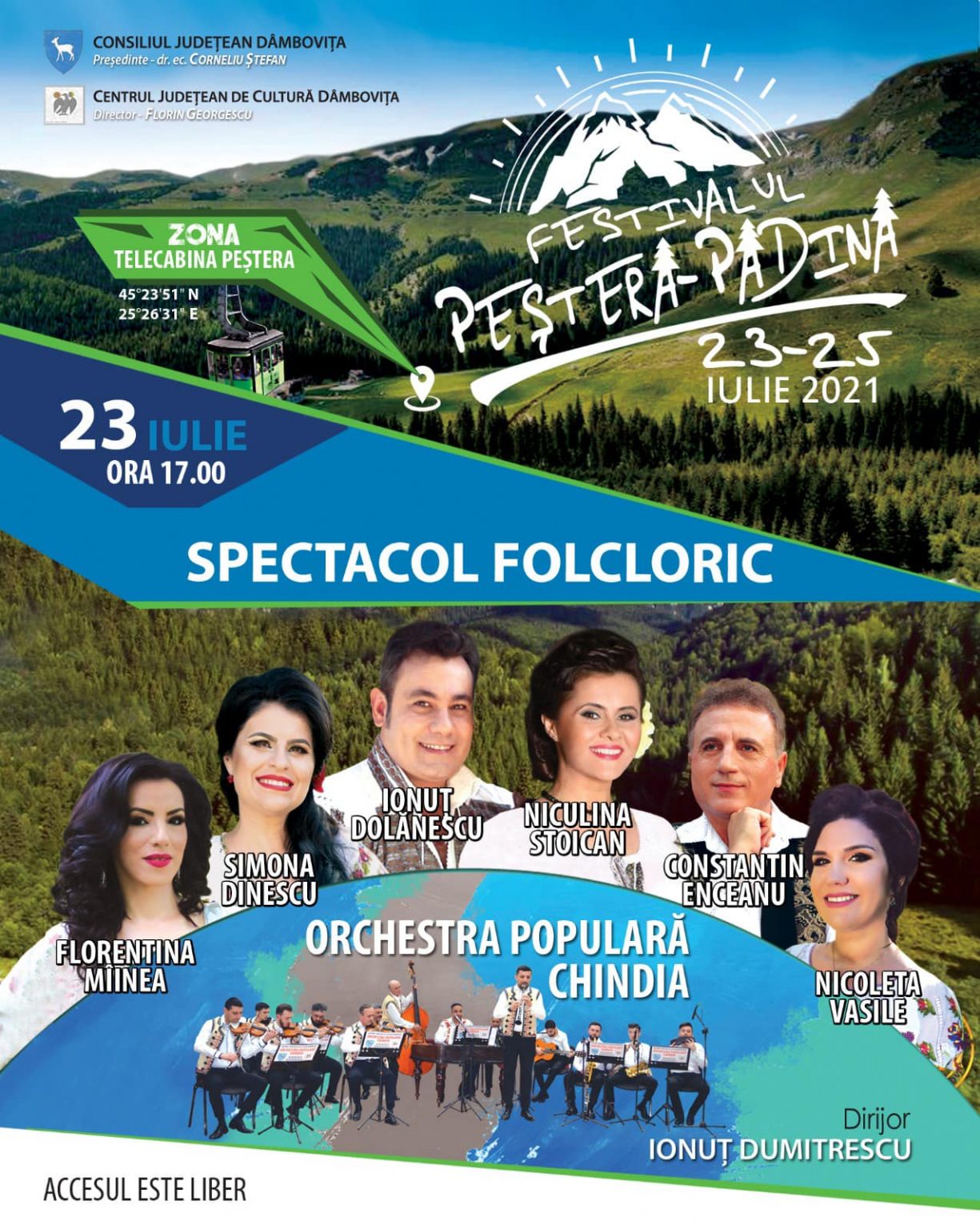 Festivalul „Peștera-Padina”, 23 – 25 iulie,în zona „Telecabina Peștera” , Consiliul Județean Dâmbovița vă invită, în acest sfârșit de săptămână, la 1.500 metri altitudine, fiecare dintre cele trei zile ale festivalului, eveniment organizat prin Centrul Județean de Cultură Dâmbovița, va promova câte un gen muzical.