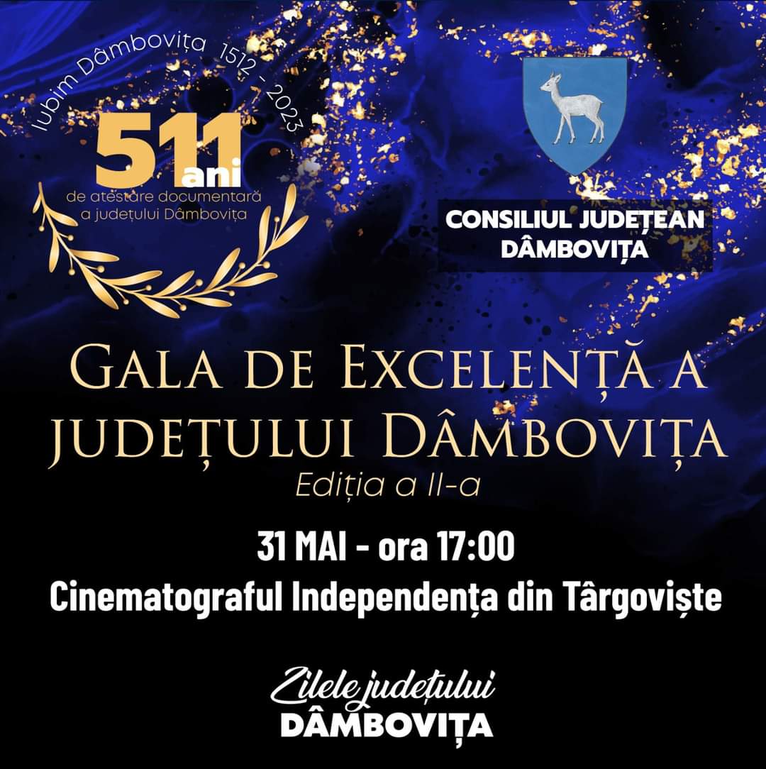 Gala de excelență a județului Dâmbovița, ediția a II-a, în cadrul Zilelor Județului Dâmbovița, miercuri, 31 mai 2023, ora 17.00.