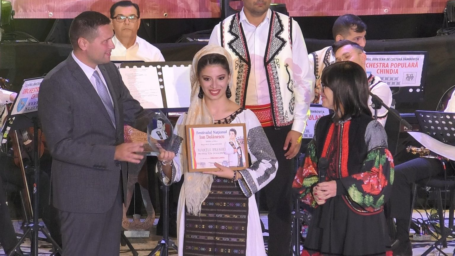 Președintele CJ Dâmbovița, Corneliu Ștefan  și președintele juriului Elise Stan, prof. dr. şi realizator de emisiuni la Televiziunea Română, au acordat Trofeul Festivalului-Concurs „Ion Dolănescu”-2022, câștigat de Larisa Cârlugea  din Gorj.