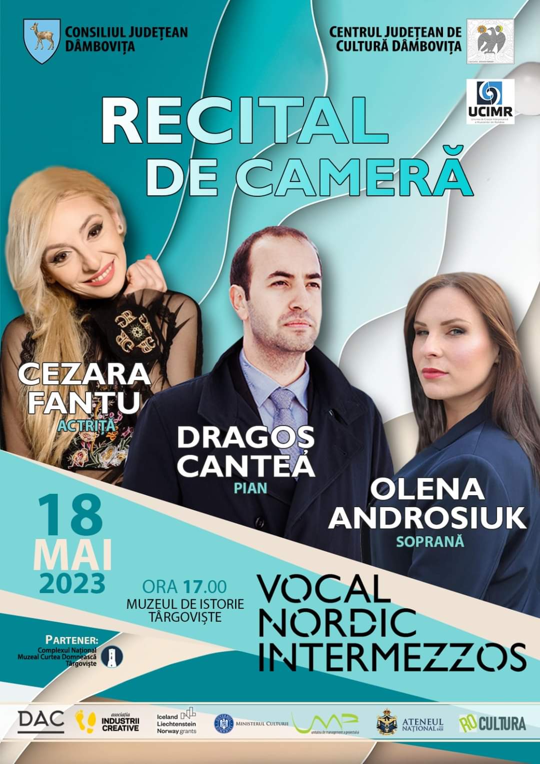 Astfel, joi, 18 mai, vă așteptăm la Muzeul de Istorie, începând cu ora 17:00, la Recitalul „Vocal Nordic Intermezzos”, suținut de Dragoș Cantea – pian, Olena Androsiuk – soprană și Cezara Fantu – actriță. Invitat special: Grace Jee Eun Oh, pianist.
