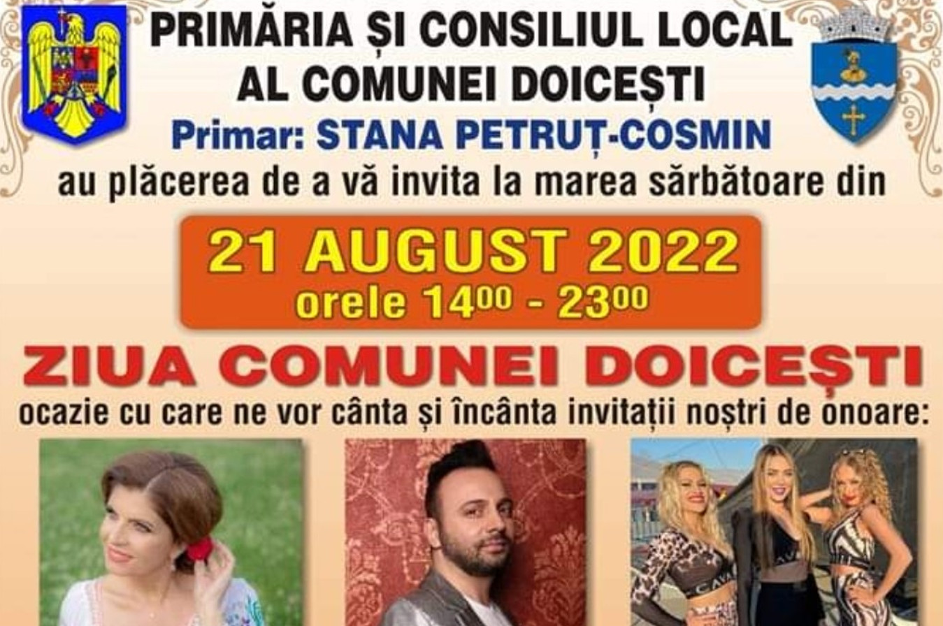 Pe scenă vor urca interpreți de renume precum Mariana Ionescu Căpitănescu, Ronna Riva, Ovi, Valentin Sanfira, Mariana Stan, Gigi Stoica, Nicolae Datcu, Ansamblul „Junii Voievozi”, Violeta Barac și John Music: „Primăria și Consiliul Local al Comunei Doicești, au deosebita plăcere de a vă invita la manifestările dedicate Zilei Comunei 《DOICEȘTI ÎN STRAIE DE SĂRBĂTOARE 》care va avea loc duminica, 21 august, începând cu ora 14:00, în Parcul Mateiaș.