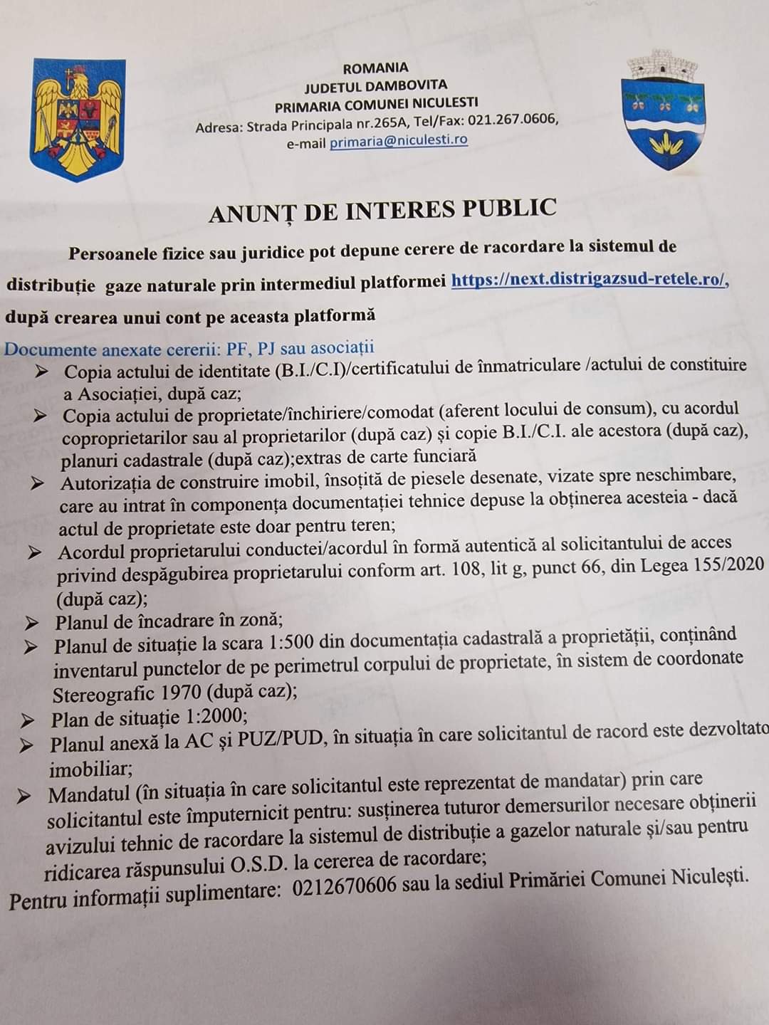 ANUNȚ IMPORTANT făcut de primarul comunei Niculești, Dorinel Soare , s-a finalizat obiectivul de investiție „Alimentarea cu gaze naturale a comunei Niculești”.