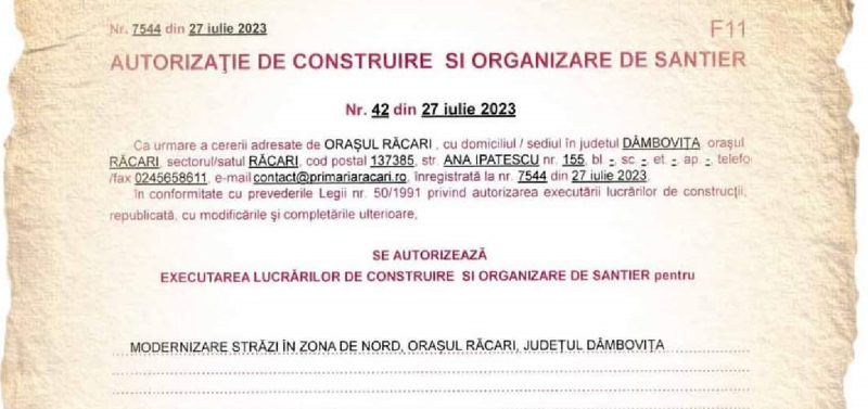 Încep lucrările de asfaltare și modernizare străzi în zona NORD, orașul Răcari, edilul Marius Caravețeanu a anunțat ca a fost emisă autorizația de construire și organizare șantier pentru pentru obiectivul: “Modernizare străzi în zona NORD, orașul Răcari, județul Dâmbovița ’’,