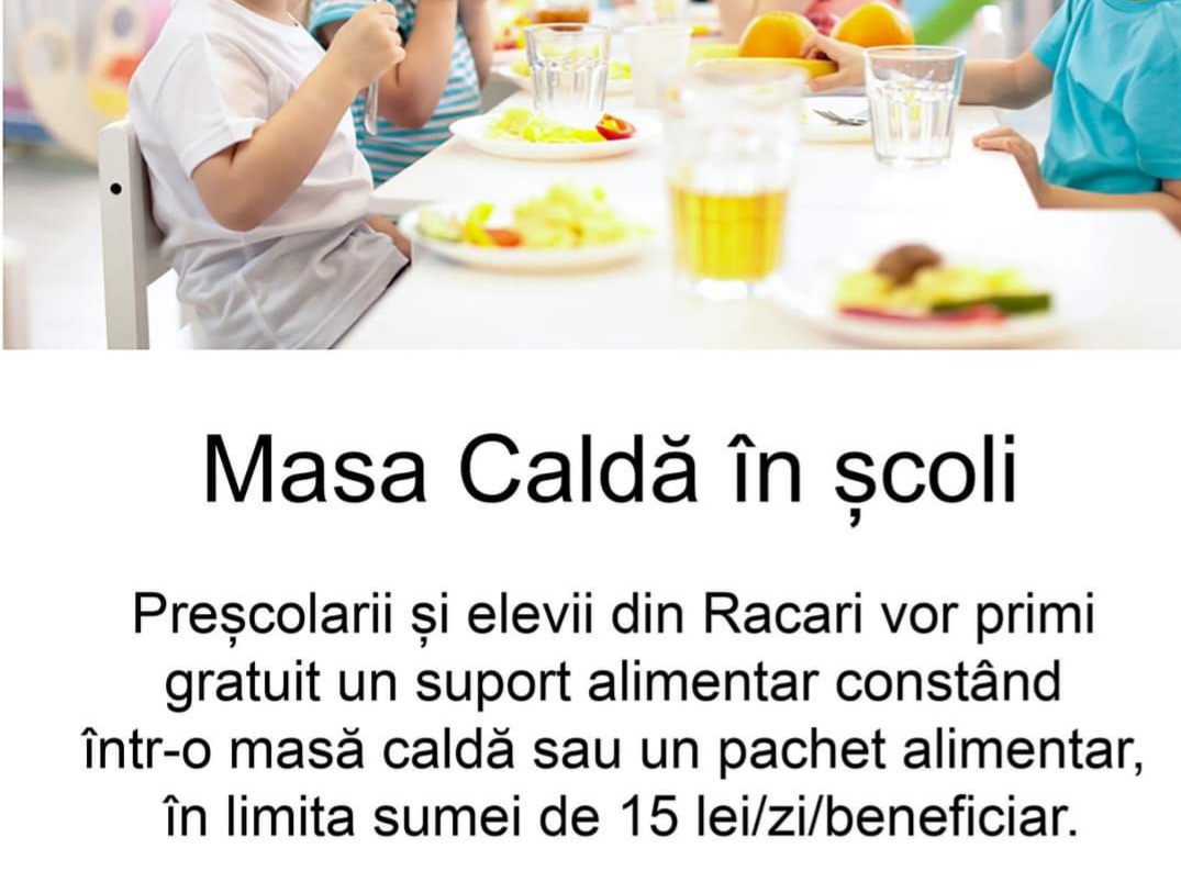 Preșcolarii și elevii din Răcari vor primi gratuit un suport alimentar constând într-o masă caldă sau un pachet alimentar, în limita sumei de 15 lei/zi/beneficiar.