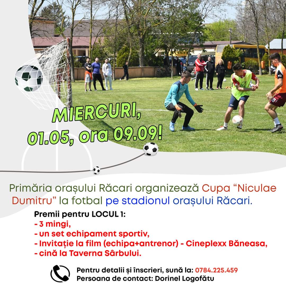 Primăria orașului Răcari organizează Cupa “Niculae Dumitru” la fotbal, pe stadionul orașului Răcari, miercuri, 01.05.2024, ora 09:09.