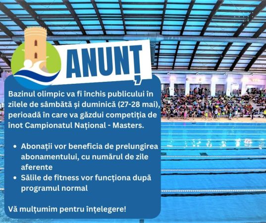 Campionatul Național Masters -Înot are loc la Târgoviște? Federația Română de Natație și Pentatlon Modern a publicat programul Campionatului Național – Masters, ce va fi găzduit la Complexul Turistic de Natație Târgoviște, în weekend-ul 27-28 mai. Concursul va cuprinde două reuniuni, sâmbătă (interval orar 13.00 – 18.00) și duminică (interval orar 9.00 – 15.00).
