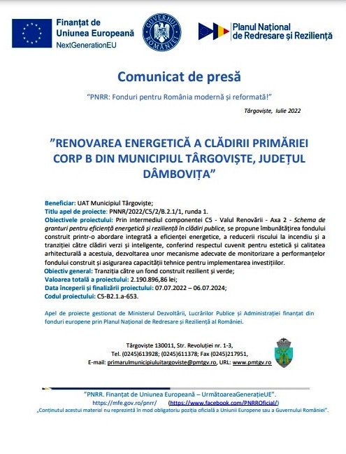 „RENOVAREA ENERGETICĂ A CLĂDIRII PRIMĂRIEI CORP B DIN MUNICIPIUL TÂRGOVIȘTE, JUDEȚUL DÂMBOVIȚA”