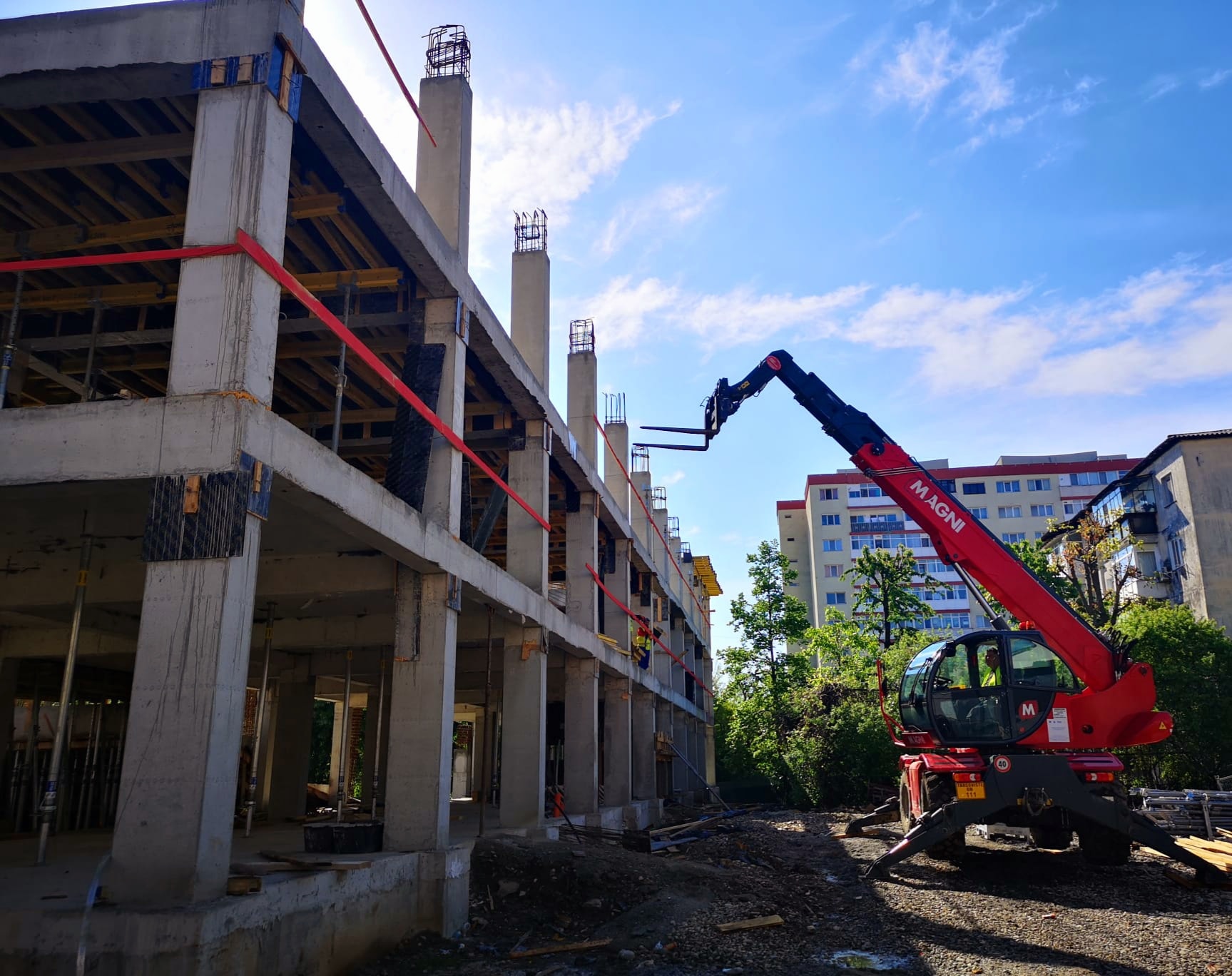 Se lucrează la cofrarea plăcii peste etajul 2 al corpului administrativ, s-a turnat betonul la gradena din sala de festivități, s-au montat stâlpii metalici pentru extinderea sălii de sport.