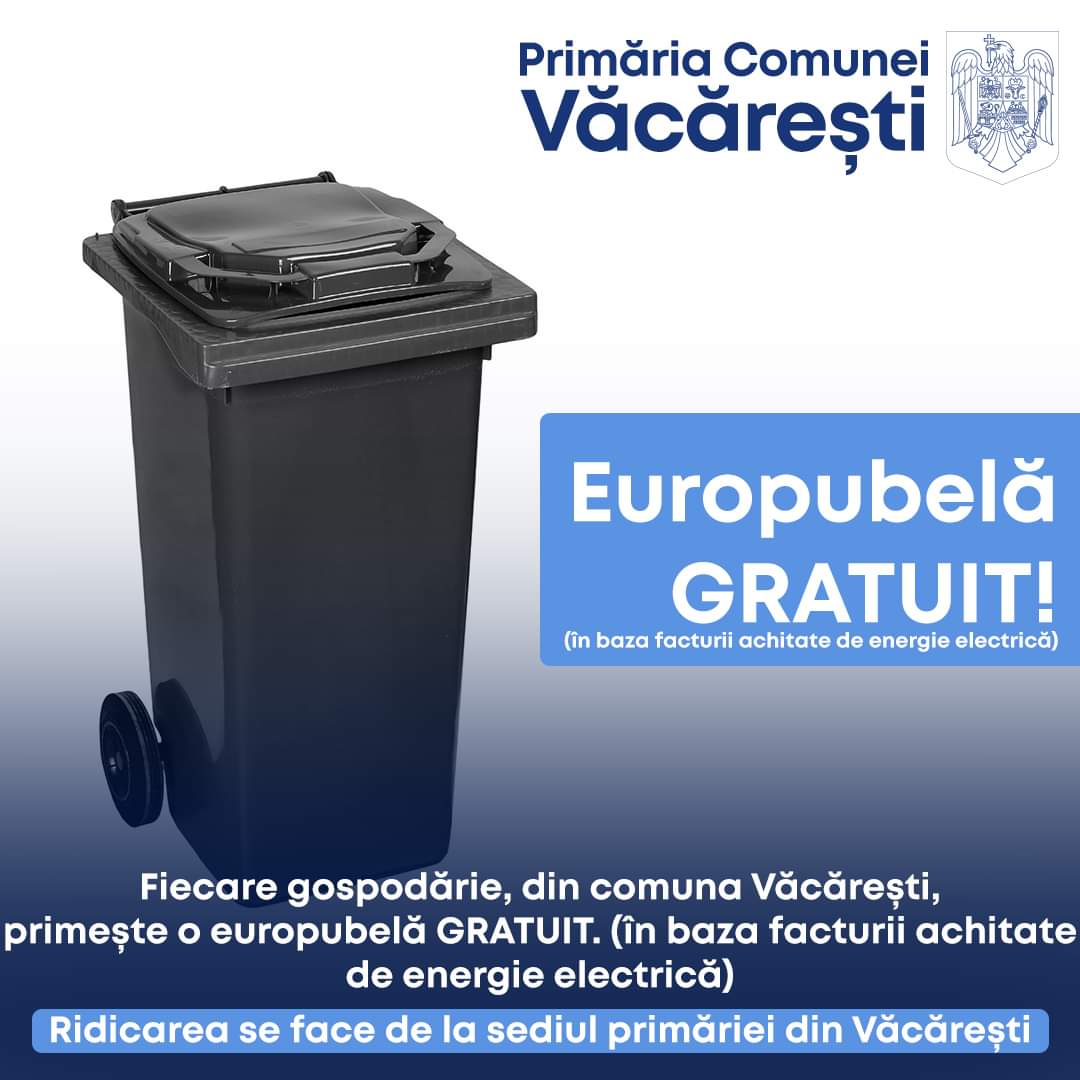 Anunț important pentru locuitorii comunei Văcărești, Primăria Văcărești vă informează că sunteți așteptați la sediul primăriei din Văcărești pentru a intra în posesia pubelei pentru gunoi care vă este oferită în mod GRATUIT (în baza ultimei facturi achitate de energie electrică).