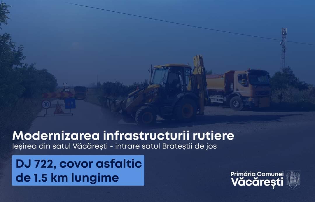 În comuna Văcărești se lucrează la modernizarea DJ 722, de la ieșirea din satul Văcărești până la intrarea în satul Brăteștii de Jos, o noua investiție ce vizează modernizarea infrastructurii rutiere.