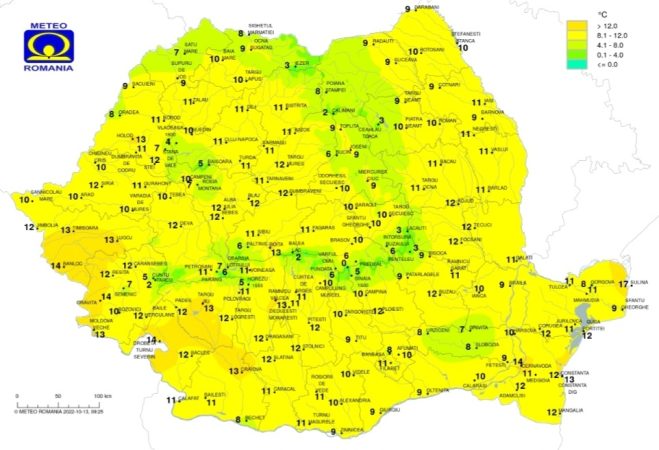13 octombrie 2022,  instabilitate atmosferică în cea mai mare parte a teritoriului, dar și cu vreme închisă și precipitații ce vor lua aspect de lapoviță și chiar ninsoare.