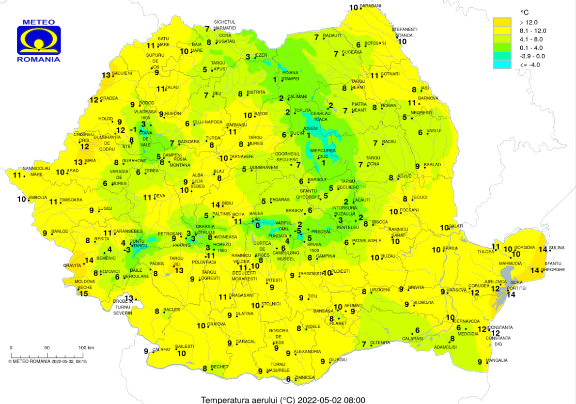 2 mai 2022, temperaturile maxime se încadrează între 23 și 14 grade, pe când minimele se încadrează între 11 și 1 grad.