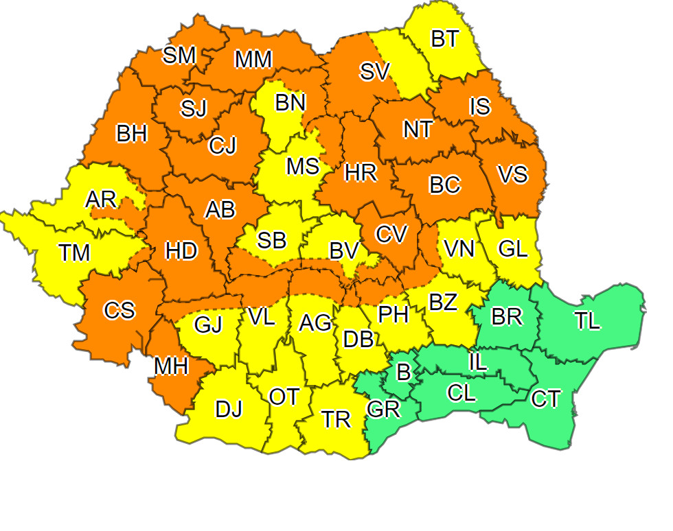 În zona de munte, sudul Banatului, nordul Crișanei, Maramureș, vestul și estul Transilvaniei, centrul Moldovei, precum și în vestul Olteniei vor fi averse torențiale, descărcări electrice, vijelii și grindină de medii dimensiuni, iar în intervale scurte de timp (1-3 ore) sau prin acumulare cantitățile de apă vor fi de 30…40 l/mp și izolat peste 50…70 l/mp.