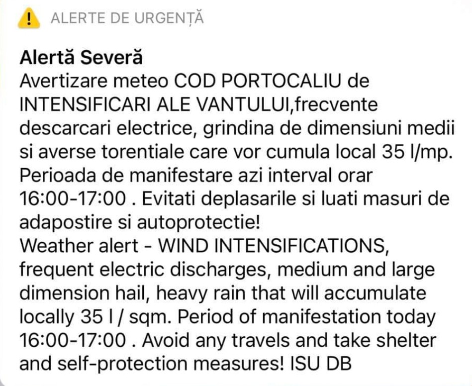 Se vor semnala : averse torențiale care vor depăși 35 l/mp, frecvente descărcări electrice, grindină, intensificări ale vântului. S-a emis și RO-ALERT!