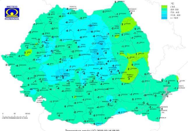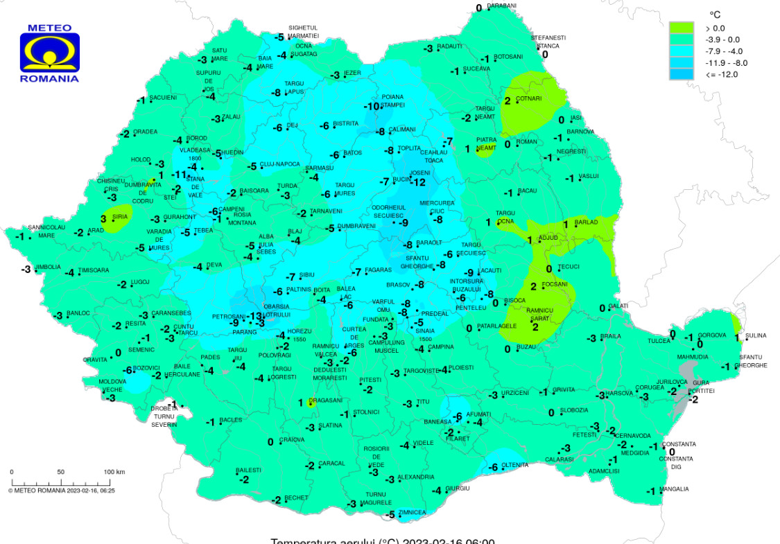 Astăzi, 16 februarie, temperaturile maxime se vor încadra între 3 și 13 grade, iar cele minime între -7 și 3 grade, vântul va sufla slab și moderat, cu intensificări în zona montană înaltă, în special în a doua parte a intervalului, dar la intensități mai mici și pe litoral.