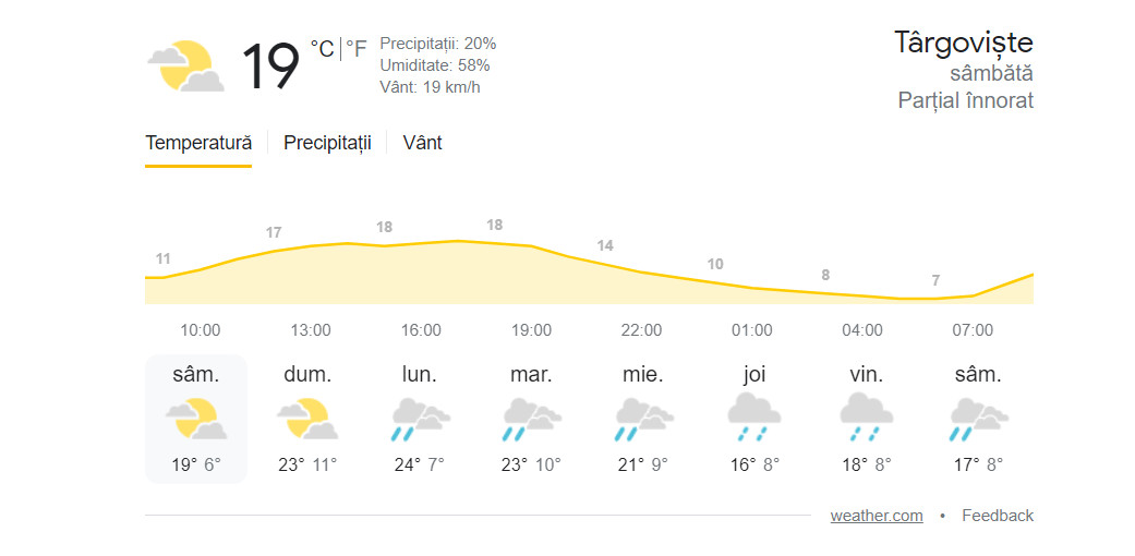 Astăzi, 23 aprilie 2022, instabilitatea atmosferică începe să își facă simțită prezența pe tot parcursul zilei, temperaturile maxime se vor încadra între 14 și 23 de grade Celsius, în timp ce temperaturile minime se vor situa între 5 și 11 grade Celsius.