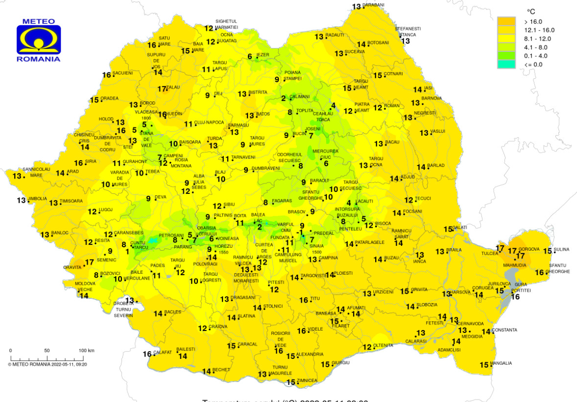 Temperaturile maxime de astăzi se încadrează între 27 și 17 grade, pe când minimele se încadrează între 15 și 5 grade, fiind chiar și mai scăzute în depresiunile din Transilvania.