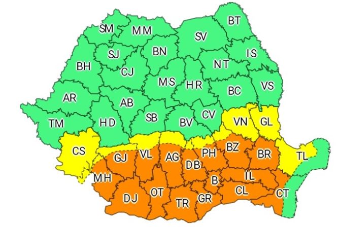 Notă: Începând de după-amiază, vor fi perioade scurte cu instabilitate atmosferică accentuată, ce se va manifesta prin intensificări ale vântului, vijelii, grindină, descărcări electrice și averse torenţiale.În funcţie de evoluţia şi intensitatea fenomenelor meteorologice, Administraţia Naţională de Meteorologie va actualiza prezentul mesaj.