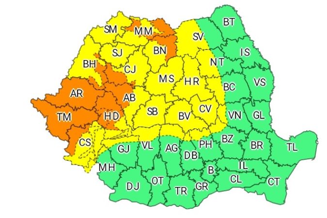 Local în Banat, Crișana, vestul Transilvaniei și nordul Carpaților Orientali vor fi perioade cu averse torențiale, vijelii puternice, frecvente descărcări electrice și pe arii restrânse grindină. În intervale scurte de timp sau prin acumulare se vor înregistra cantități de apă de peste 40…60 l/mp și izolat 70 l/mp.