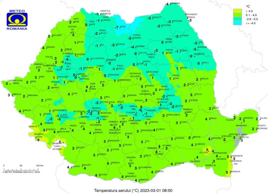 Temperaturile maxime se vor încadra între 4 și 11 grade Celsius, izolat mai scăzute în nord-est, iar temperaturile minime se vor încadra între -5 și 3 grade Celsius.