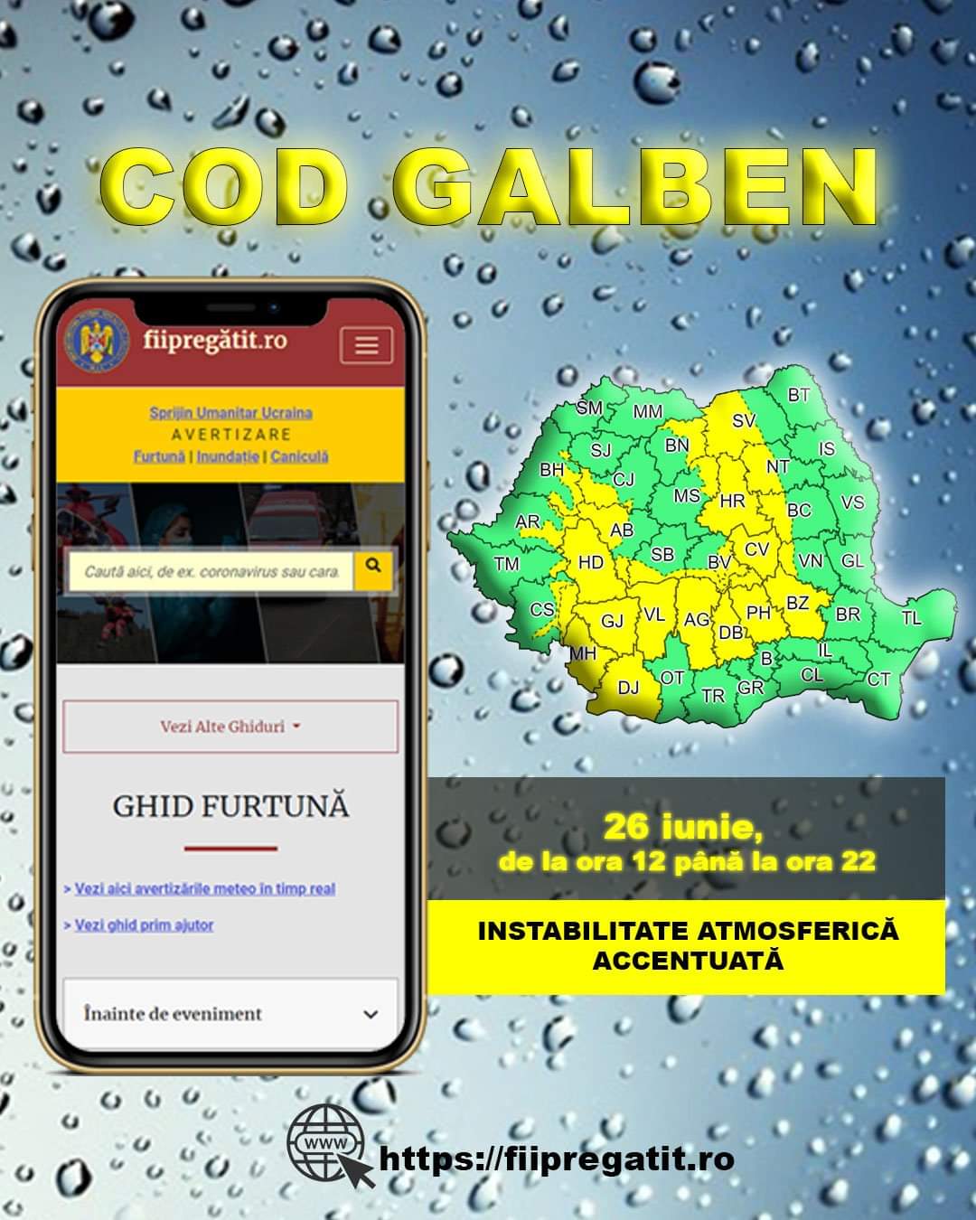 COD GALBEN de FURTUNI în județul Dâmbovița, 26 iunie, de la ora 12 până la ora 22, în intervalul menționat, vor fi perioade cu instabilitate atmosferică accentuată, care se va manifesta prin averse torenţiale, descărcări electrice, intensificări ale vântului și izolat vijelii şi grindină. Cantitățile de apă vor depăși 25…30 l/mp și pe alocuri 40 l/mp.
