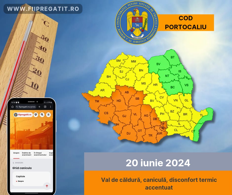 COD PORTOCALIU de CANICULĂ valabil pentru 20 iunie 2024, în tot județul Dâmbovița, maximele se vor situa între 34-38 de grade, va fi caniculă, iar indicele temperatura-umezeală (ITU) va depăși pragul critic de 80 de unități.