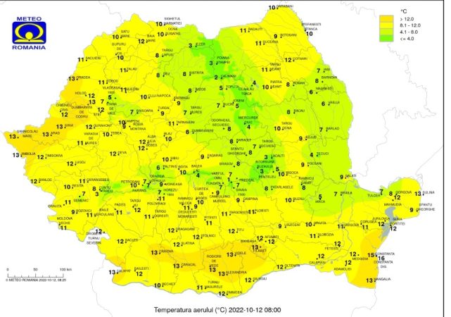 Cum va fi vremea în România, 12 octombrie 2022, valorile termice se vor situa în jurul normelor climatologice, astfel că maximele vor fi cuprinse între 15 și 20 de grade, iar cele minime între 6 și 13 grade.