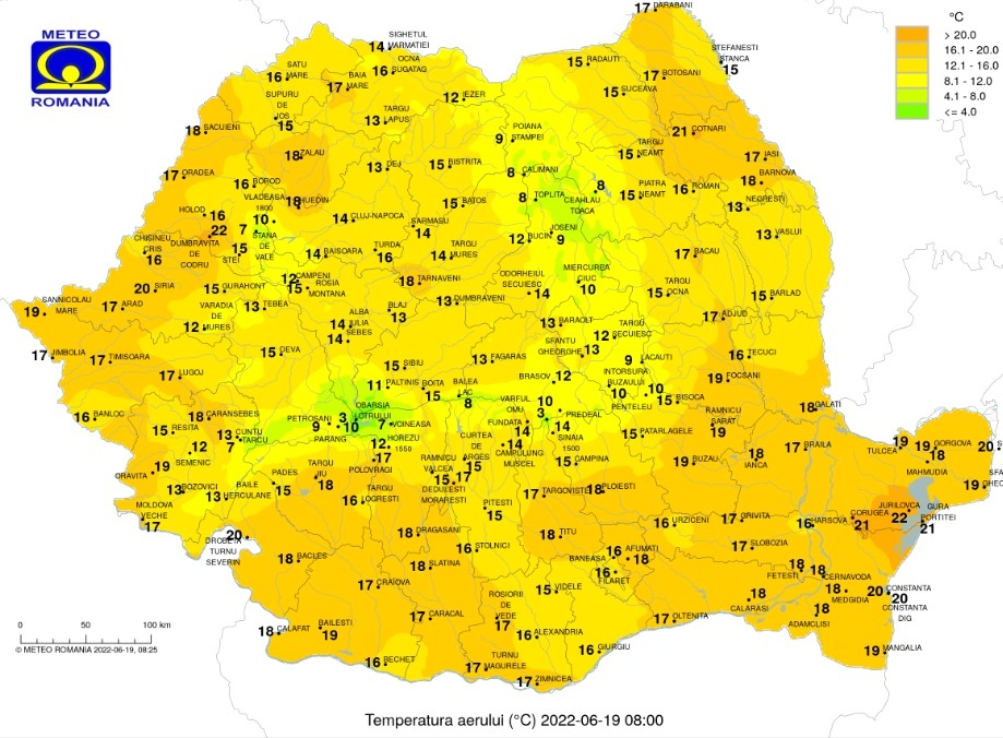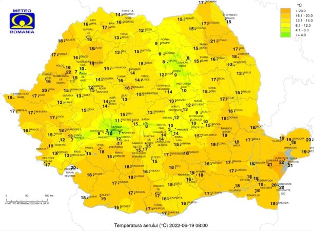 Duminică, 19 iunie 2022, se anunță vreme călduroasă, temperaturile maxime se vor încadra în general între 26 și 31 de grade, iar cele minime între 6 grade în depresiunile din estul Transilvaniei şi 20 de grade în Dealurile de Vest.
