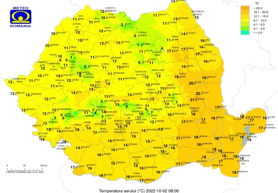 Duminică, 2 octombrie, potrivit ANM, temperaturile vor fi în scădere, pe parcursul zilei, cerul va fi variabil, cu înnorări temporare și local ploi slabe – mai ales în nordul și centrul țării, însă noaptea nebulozitatea se va accentua treptat și va ploua în nord, nord-vest, centru și la munte și pe arii restrânse în rest, iar izolat vor fi posibile cantități de apă mai însemnate.