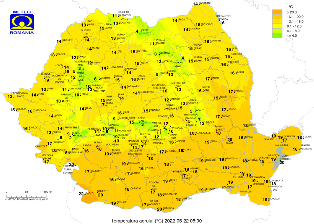 Duminică, 22 mai 2022, valorile termice vor scădea în cea mai mare parte a ţării, maximele se vor încadra între 19 şi 31 de grade, iar cele minime, în general, între 5 şi 15 grade.