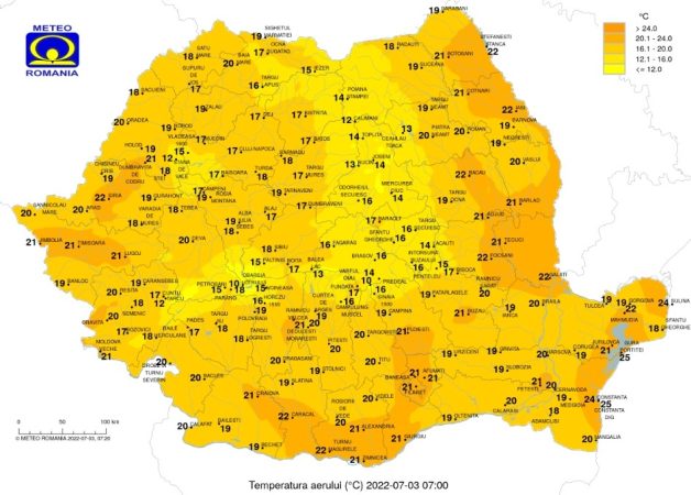 Duminică, 3 iulie 2022, local caniculară în zonele de câmpie, din a doua parte a zilei, averse, descărcări electrice, intensificări ale vântului ce vor lua şi aspect de vijelie, poile vor avea şi caracter torenţial, iar pe arii restrânse cantităţile de apã vor depăşi 20…40 l/mp şi va cădea grindină.
