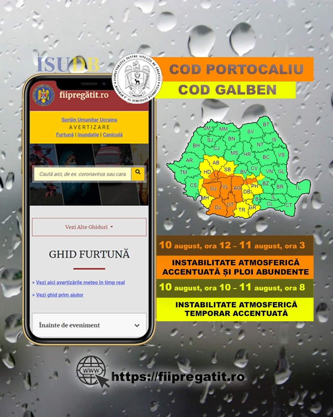 În intervalul 10 august, ora 12:00 – 11 august, ora 03:00 în nordul județului Dâmbovița vor fi perioade cu averse torențiale, iar în intervale scurte de timp, dar mai ales prin acumulare, se vor înregistra cantități de apă de 40…50 l/mp și pe arii restrânse de peste 70 l/mp. Acestea vor fi asociate și cu descărcări electrice, intensificări ale vântului și izolat grindină.