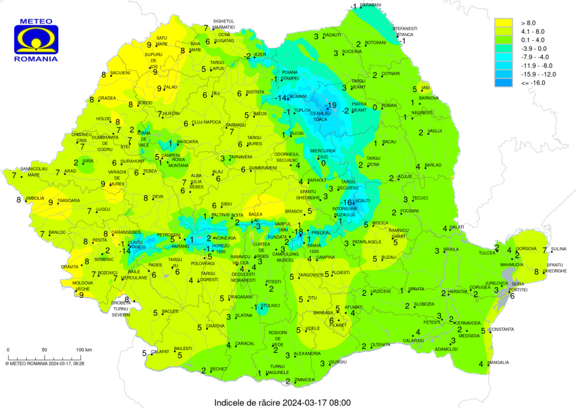 Temperaturile vor oscila considerabil, cu valori mai scăzute, mai ales în jumătatea nordică a țării, și maxime care nu vor depăși 7-8°C în unele regiuni. În sud, se vor înregistra temperaturi de aproximativ 10-11°C, iar în extremitatea de sud-vest se vor atinge 13-14°C.