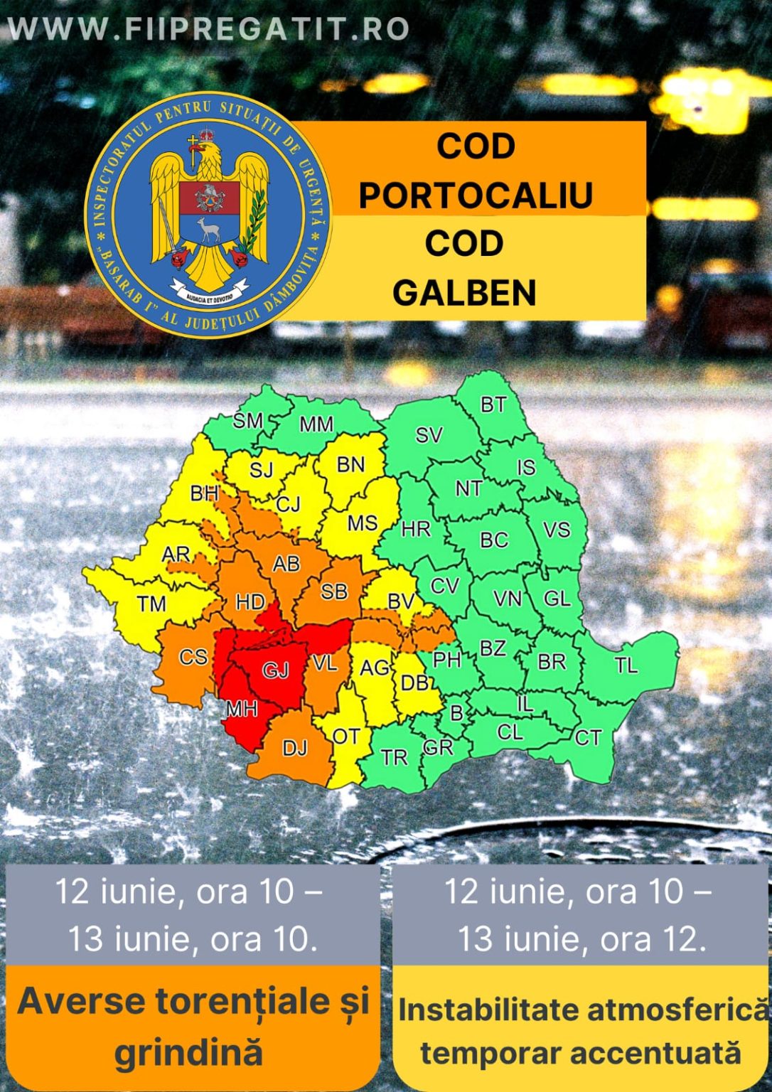 Există și o AVERTIZARE METEOROLOGICĂ COD PORTOCALIU valabilă doar pentru zona montană a județului Dâmbovița în intervalul 12 iunie, ora 10 – 13 iunie, ora 10.