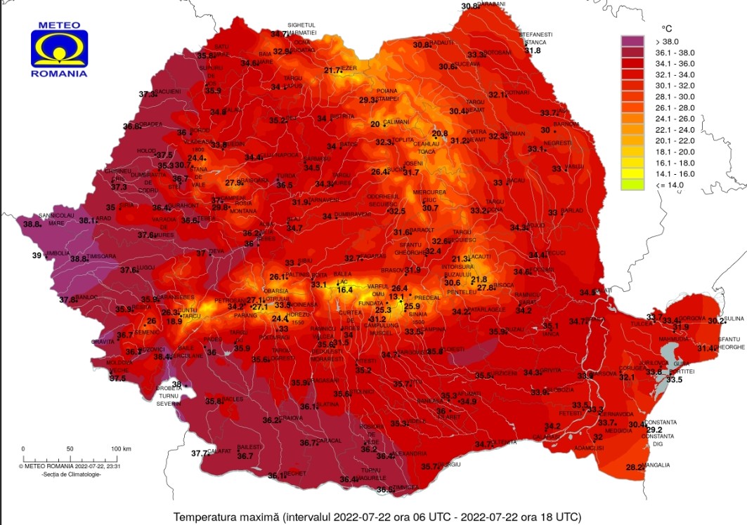 Prognoza meteo- 23 iulie 2022, temperaturile maxime se vor încadra în general între 30 şi 40 de grade, dar și cu valori mai scăzute, de 28…30 de grade pe litoral şi în deltă, iar cele minime vor fi cuprinse între 15 şi 23 de grade, mai scăzute în depresiuni şi mai ridicate în Dealurile de Vest.