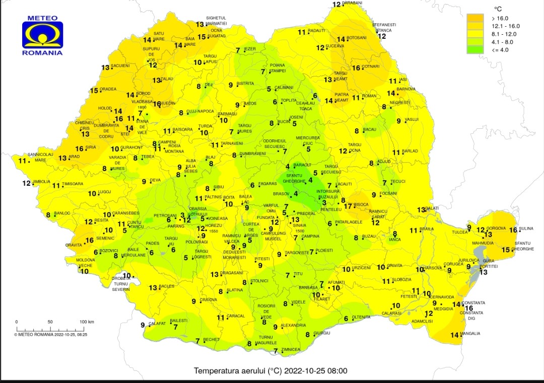 Prognoza meteo, marți, 25 octombrie, temperaturile maxime vor fi cuprinse în general între 17 şi 27 de grade, cu cele mai ridicate valori în Lunca Dunării şi Dobrogea continentalã, iar cele minime se vor încadra între 7 şi 15 grade. Vântul va sufla slab şi moderat, cu intensificãri, local, la munte şi izolat în zonele mai joase de relief.