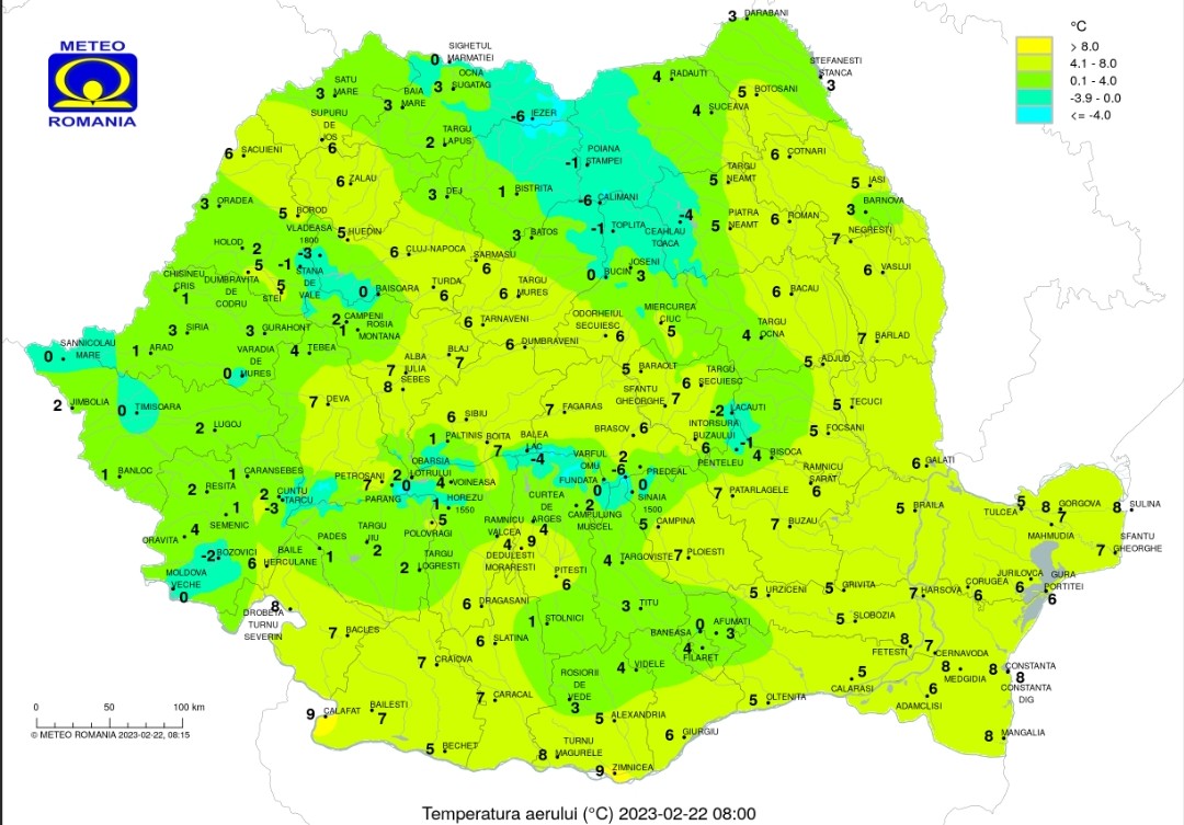 Prognoza meteo miercuri, 22 februarie 2023, valorile termice vor scădea uşor, cu precădere în jumătatea de nord-est a ţării. Temperaturile maxime se vor încadra între 6…8 grade în nordul Moldovei şi estul Transilvaniei şi 17…19 grade în vestul şi sudul Olteniei, precum şi în sud-vestul Munteniei, iar minimele termice vor fi cuprinse în general între -4 şi 5 grade.