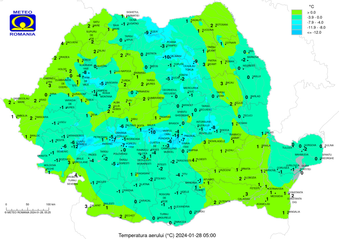 Prognoza meteo pentru 28 ianuarie 2024,vântul va mai avea intensificări în Carpaţii Meridionali şi de Curburã, îndeosebi la altitudini de peste 1700 m, cu rafale de 80….90 km/h ce va determina viscol şi vizibilitate redusã.