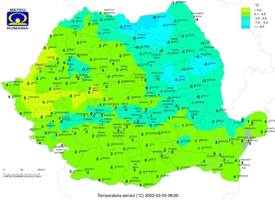 Temperaturile minime vor fi cuprinse între -4 şi 5 grade, mai scãzute în nordul Moldovei spre -7 grade. Pe alocuri în zonele joase va fi ceaţã.