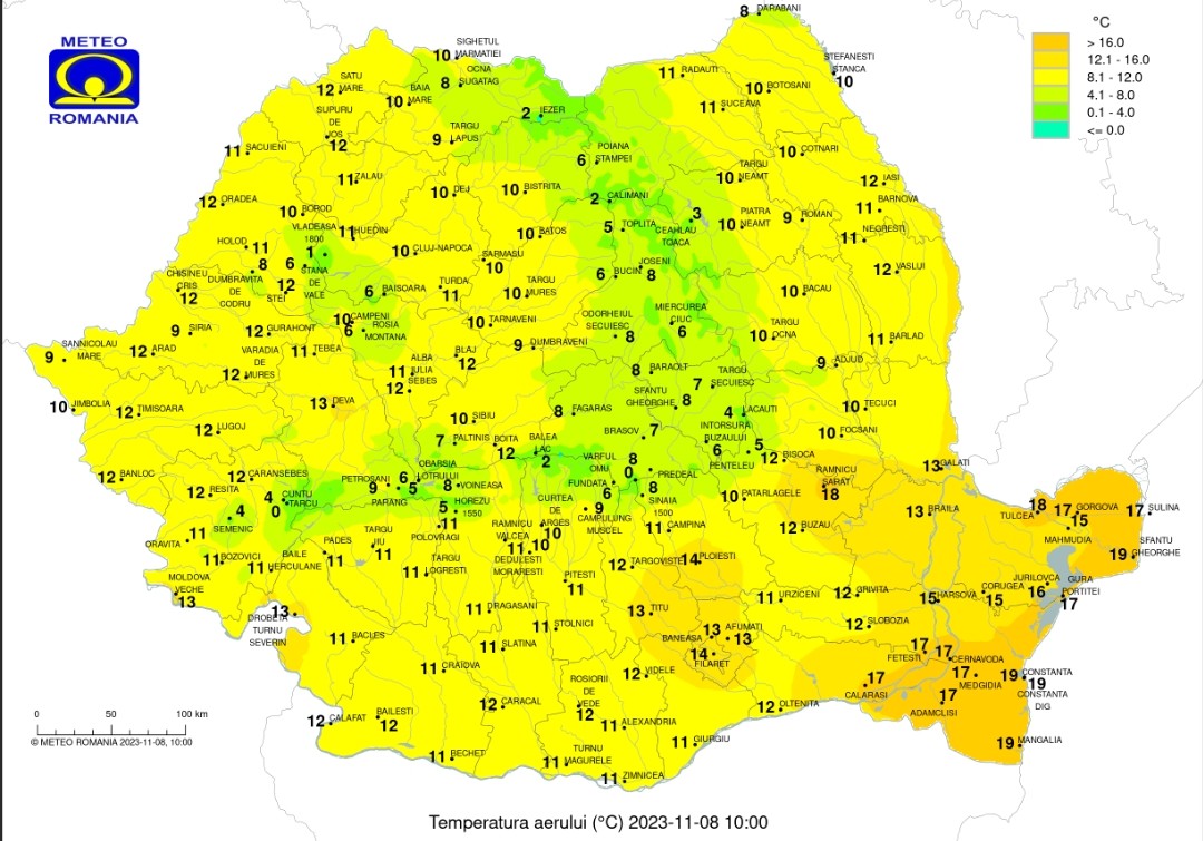 Prognoza meteo pentru 8 noiembrie, vreme ploioasă și rece, cerul va avea înnorãri şi va ploua, în nordul, în centrul ţării, la munte, local în sud şi est şi izolat în vest.