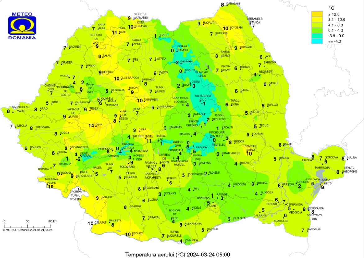 Prognoza meteo pentru astăzi, 24 martie 2024, în vestul, nord-vestul și centrul țării valorile termice vor fi în scădere față de intervalul anterior, astfel încât se vor situa în jurul celor specifice datei și, mai ales ziua, nebulozitatea va fi în general persistentă și temporar va ploua.
