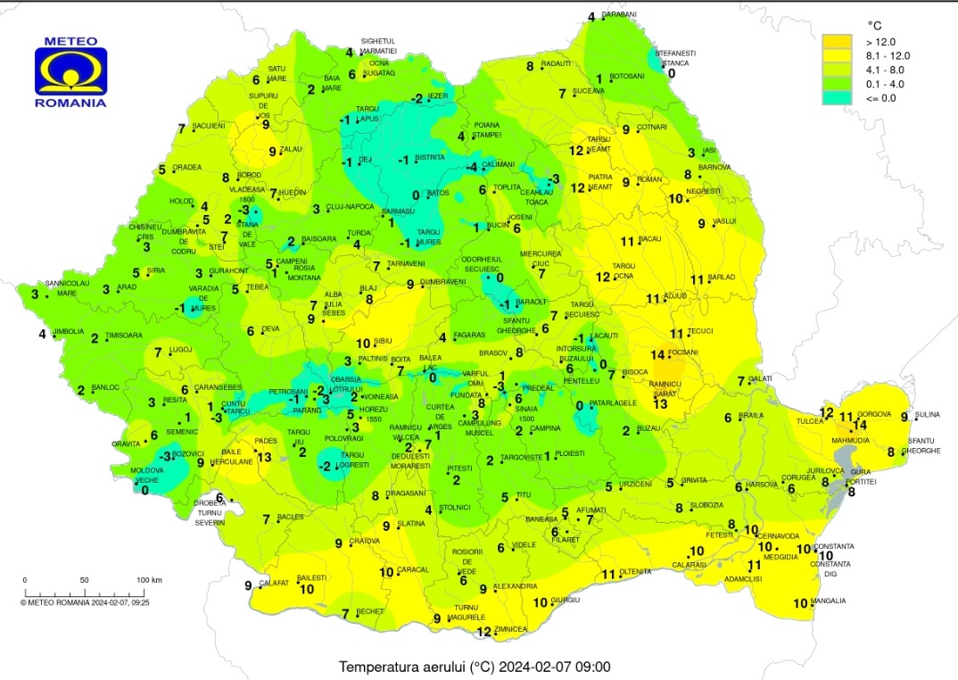 Prognoza meteo pentru astăzi, 7 februarie 2024, vremea se va menține caldă. Temperaturile maxime vor fi cuprinse în general între 10 și 18 grade, iar cele minime între -2 și 9 grade.