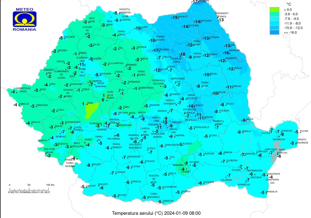 Prognoza meteo pentru astăzi, 9 ianuarie: Vor fi temperaturi maxime preponderent negative în toată țara cuprinse în general între -8 și 0 grade, iar noaptea de marți spre miercuri va fi ger în nord, în centru și în est cu minime termice ce vor coborî spre -20, -18 grade.